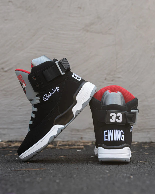 The flagship Ewing Athletics shoe, the 33 HI is an exact retro of the 1990 original, and features a classic reversible ankle strap that can be worn on the front or back of the shoe, and a full length PU midsole for cushioning. This colorway features a Black Nubuck upper with Grey and Red accents.